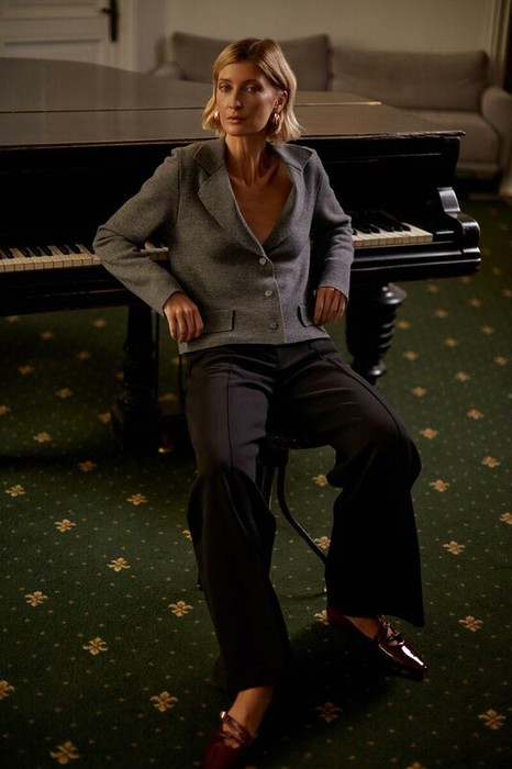 Брюки прямого кроя со стрелкой и боковыми карманами из плотного гладкого трикотажа интерлок.