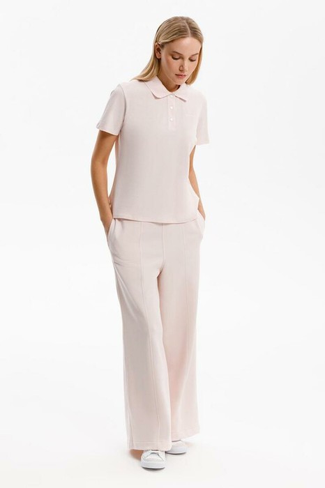 Брюки свободного силуэта со стрелками из мягкого двухцветного футера. Внутренняя сторона изделия представлена в натуральном цвете хлопка, внешняя в нежно-розовом. За счет использования крашенной пряжи, данный вид полотна прошел минимальную обработку, что придало изделию мягкость и шелковистость.