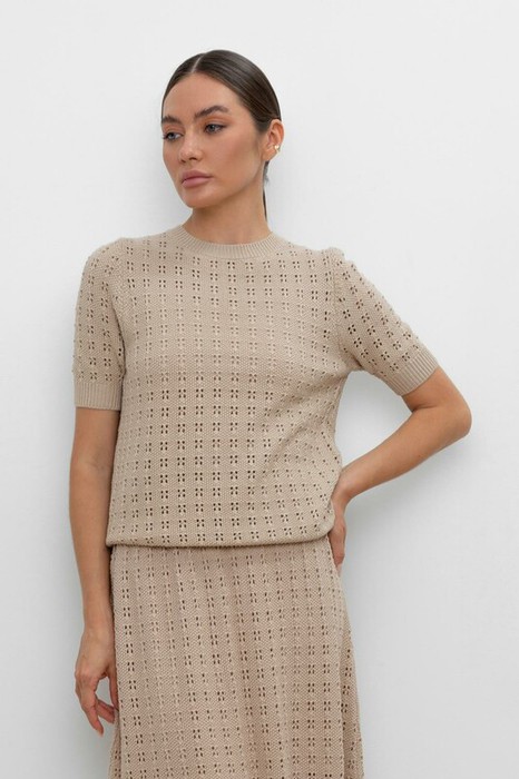 Укороченная вязаная ажурная футболка. Манжеты и пояс, связаные ластиком придают изделию небольшой объем. Состав 50% хлопок, 50% акрил. Благодаря акрилу в составе изделие не пилингуется.