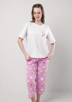Легкий комплект для комфортного сна и отдыха из натурального хлопка. Футболка с V-образным вырезом комфортно садится по фигуре.  Брюки с поясом на резинке выполнены из набивного трикотажа. Гладкий материал приятен к телу и позволяет коже дышать.
