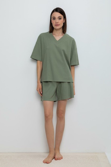 Комплект для комфортного отдыха из вафельного полотна. Укороченная футболка с короткими рукавами и спущенной линией плеча комфортно садится по фигуре. Шорты с мягким поясом на резинке и имитацией гульфика с пуговицами. Свободный силуэт не сковывает движения.
