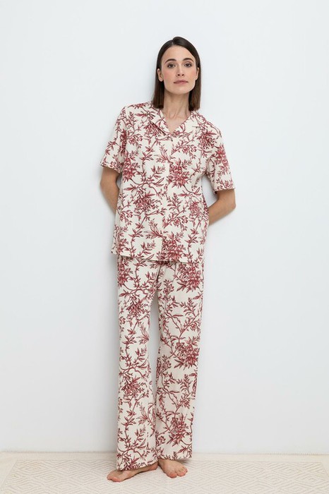 Комплект для комфортного сна из набивного трикотажа с нежным  рисунком из 100% натурального  хлопка. Рубашка с короткими рукавами на пуговицах . Брюки с мягким поясом на резинке. Гладкий материал приятен к телу, не теряет форму и позволяет коже дышать.