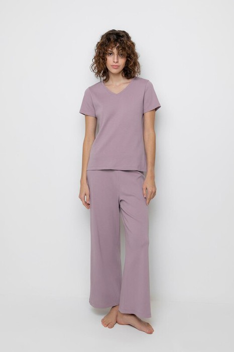 Комплект для комфортного сна и отдыха из трикотажного полотна в рубчик. Свободная футболка с V- образным вырезом. Брюки с мягким поясом на резинке удобно садятся по фигуре.