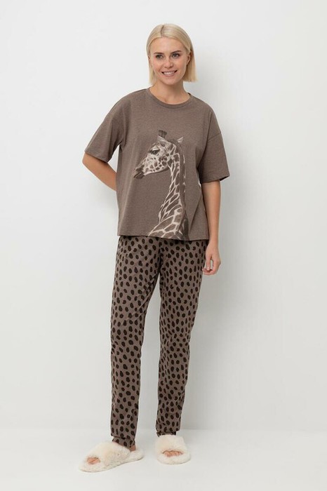 Легкий комплект для комфортного сна и отдыха из натурального хлопка. Футболка с карманом и спущенной линией плеча комфортно садится по фигуре. Брюки с поясом на резинке выполнены из набивного трикотажа. Гладкий материал приятен к телу и позволяет коже дышать.