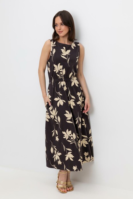 Легкое платье с круглым вырезом, короткими рукавами и поясом на резинке из набивного трикотажа супрем. Все трикотажные полотна производятся в соответствии с нормами Швейцарского сертификата ЭкоТекс. Сделано в России