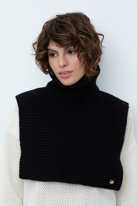Уютная вязаная манишка с высоким воротником из шерсти и акрила. Шерсть в составе хорошо удерживает тепло, а волокна акрила делают изделие мягким и предотвращают деформацию и появление катышек. Лаконичный крой хорошо сочетается с верхней одеждой.