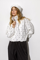 Детали: О-силуэт, расширенные плечи, высокий воротник стойка, пояс и манжеты на резинке, застёжка на молнию, функциональные карманы, куртка на подкладке. Ветровка из текстильной ткани с вышивкой «горошек».