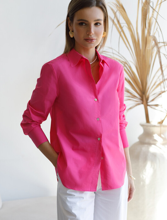 Блузка выполнена из премиального хлопкового поплина. Лаконичная модель с высокими манжетами и пуговицами из натурального перламутра хорошо впишется в любой гардероб и внесет яркий летний акцент в образ. Натуральный состав ткани обладает высокой воздухопроницаемостью и гигроскопичностью. В изделии будет комфортно, даже в самое жаркое время года. Подходит для любой фигуры. На спинке фирменный логотип бренда.