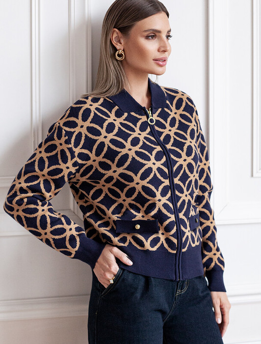 Совместные покупки Челябинск Женская одежда Кофты, кардиганы — Vilatte Бомбер двуслойной жаккардовой вязки с кашемиром D31.131 синий-бежевый