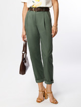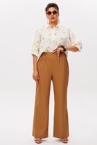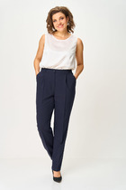 Брюки выполнены из хлопкового твила. Изделие дополнено двумя вариантами шлёвок, что позволяет использовать ремни разной ширины. Модель имеет два боковых и один задний карман. Защипы у пояса и стрелки вдоль брючины визуально вытягивают силуэт и подчеркивают талию. Благодаря наличию эластана в составе изделие сохранит свой безупречный внешний вид в течение долгого времени. Обладает высокой воздухопроницаемостью, в брюках будет комфортно даже в жаркое время года.