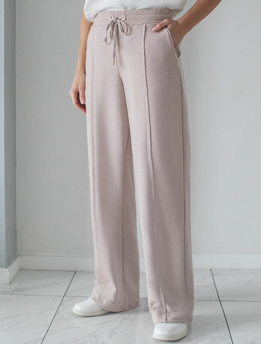 Брюки прямого кроя с удобным эластичным поясом на резинке и карманами по бокам выполнены из премиального футера-двухнитки. Наличие эластана в составе гарантирует комфорт и долговечность изделия, материал хорошо пропускает воздух, позволяя телу дышать.. Эти уютные брюки нежного цвета макиато с эффектом меланж созданы для вашего комфорта. Свободный прямой крой обеспечивает свободу движений и максимальное удобство в любых ситуациях, поэтому они подойдут и на большие размеры, а так же на высокий или низкий рост. Фигура подчеркивается, а силуэт визуально вытягивается за счет кроя палаццо и застроченных декоративных стрелок. Вы можете создать стильный образ на каждый день в сочетании с джемпером D49.139 и бомбером D49.141.  В повседневных трикотажных брюках вы будете чувствовать себя комфортно и уверенно, наслаждаясь каждым моментом дня.