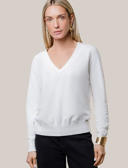 Джемпер тонкой вязки выполнен из хлопка с добавлением кашемира. Модель с V-вырезом свободного силуэта. Мягкая и очень приятная пряжа в рубчик совершенно не колется, сохраняет тепло при этом не перегревая, гарантируя безупречный комфорт.