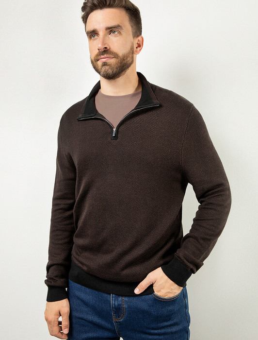 Черно-коричневый джемпер с длинными рукавами выполнен из мягкой хлопковой пряжи с добавлением акрила. Высокий воротник застегивается молнией. За счет переплетения светлых и темных нитей получилась фактурная меланжевая модель, которая, отлично держит тепло и почти не ощущается на теле. Сочетается с футболками, денимом и с чиносами, любой обувью.