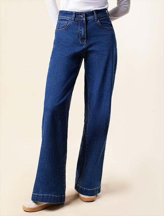 Широкие джинсы-трубы выполнены из эластичного денима. За счет высокой посадки и свободного кроя визуально удлиняют ноги. Модель в темно-синем оттенке со стиркой по праву считается универсальной, так как сочетается почти со всеми цветами, благодаря чему легко подобрать верх. Ткань очень хорошо тянется и не сковывает движений. На поясе сзади расположен нашивка из эко-кожи с логотипом бренда