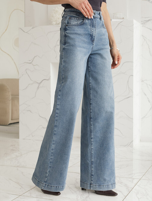 Стильные джинсы трубы синего цвета прямого кроя  выполнены из эластичного денима, что делает их особенно удобными для повседневной носки. Декоративная стирка добавляет современный акцент и подчеркивает современный дизайн. Джинсы правильного кроя  визуально вытягивают силуэт, благодаря эластану в составе аккуратно садятся на любую фигуру, подчеркивая достоинства, а обеспечивают максимальный комфорт в течение дня, не сковывая движения. Широкая размерная линейка подходит для разных типов фигур: свободные джинсы комфортны как  для обладательниц пышных форм, так и для худеньких. Вы сможете подабрать джинсы на низкий или высокий рост. Плотные джинсы идеально держат форму даже при активном движении и не вытягиваются после долгой носки. Качественная фурнитура, практичные карманы и контрастная строчка делают эти джинсы премиальными. Широкий подгиб добавляет актуальности — такой тренд отлично сочетается как с обувью на каблуке, так и на плоском ходу. Благодаря универсальному дизайну джинсы легко комбинируется с разными