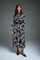 Платье длины мини с воротником поло выполнено из мягкого трикотажа на основе шелковистой эластичной вискозы. Жаккардовое переплетение образует геометрический узор. Застежка на перламутровые пуговицы подчеркивает гладкость пряжи. Контрастный воротник и манжеты делают узор еще более выразительным. Можно сочетать с жакетом D31.388 из жаккардовой коллекции.