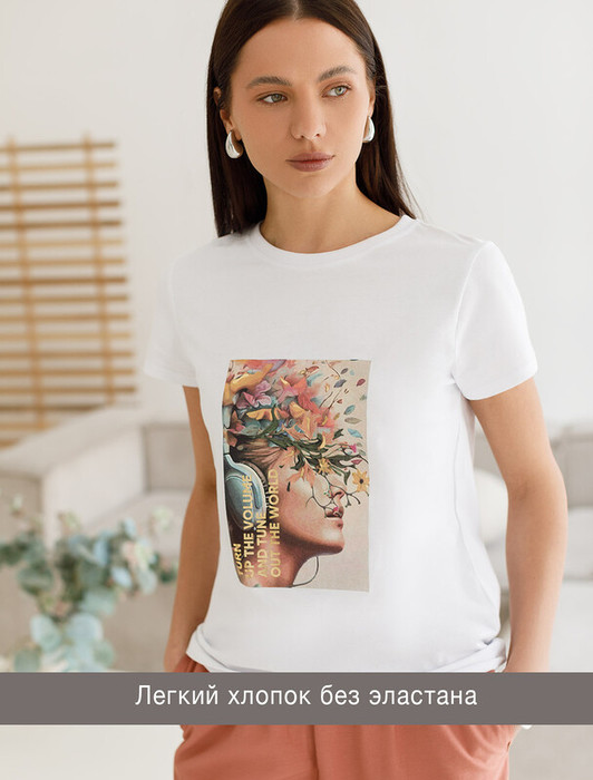 Совместные покупки Челябинск Женская одежда Футболки — Vilatte Футболка из 100% хлопка с авторским принтом. D49.092 белый_turn up the v