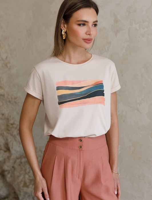 Vilatte Футболка из эластичного хлопка с принтом стразы D49.097 бежевый_soft tou