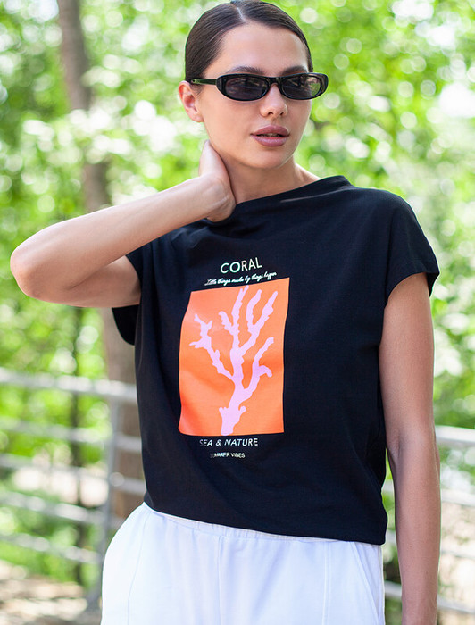 Футболка с цельнокроеным рукавом выполнена из премиального хлопка с эластаном. Авторский принт нанесен водными красками с устойчивым покрытием. Изделие отлично держит форму, почти не мнется и комфортно сидит по фигуре. Отдельным украшением служит металлический логотип бренда.