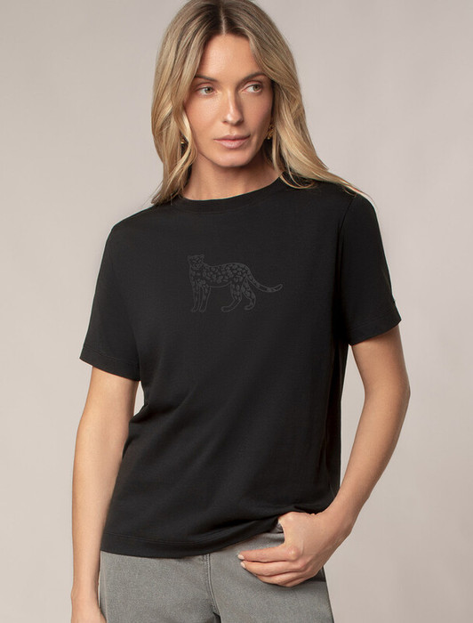 Футболка выполнена из премиального хлопка.Принт "леопард" нанесен фактурными красками с устойчивым покрытием. Наличие эластана в составе гарантирует комфорт и формоустойчивость. Изделие дополнено фирменным металлическим логотипом бренда.