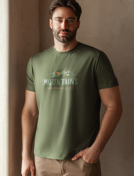 Совместные покупки Челябинск Мужская одежда Футболки — Vilatte Футболка из премиального хлопка с авторским принтом U49.045 т.оливковый_