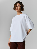 Футболка прямого кроя выполнена из длинноволокнистого 100% хлопка премиальных сортов, поэтому изделие не потеряет форму после стирки и надолго сохранит свой безупречный вид. Свободный крой подходит для любой фигуры. В комплекте со светлым, белым денимом или классическими брюками поддержит непринужденность повседневного образа.
