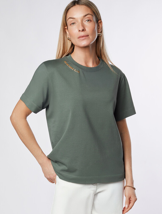 Vilatte Футболка из премиального хлопка с принтом фольгой D49.098 т.оливковый_do