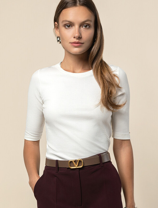 Футболка выполнена из трикотажа в широкий рубчик. Базовая модель с круглым вырезом и рукавом до локтя. Эластичный хлопковый трикотаж сидит по фигуре, не сковывает движений и очень комфортный в носке. Фактура вертикальных полос визуально стройнит и вытягивает силуэт. Базовое изделие хорошо впишется в любой гардероб. Идеально подходит для многослойных образов в базовый гардероб.
