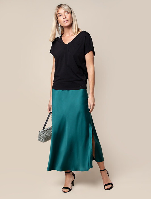 Футболка со спущенным плечом и V-вырезом сшита из премиального хлопка. На спинке изделия декоративная капля. Добавление эластана в состав способствует формоустойчивости. Футболка сохранит идеальный внешний вид в течении долгого времени. Внизу металлический логотип бренда.