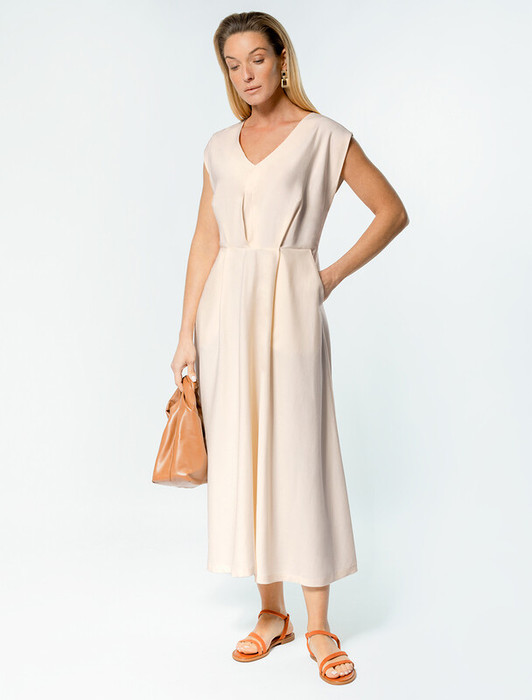 Платье выполнено из плотного лиоцелла. Модель дополнена карманами. Сзади застежка на потайную молнию. Ткань хорошо держит форму и почти не мнется. Слегка завышенная талия и пышная юбка подчеркивают романтический образ. Подходит для любой фигуры.
