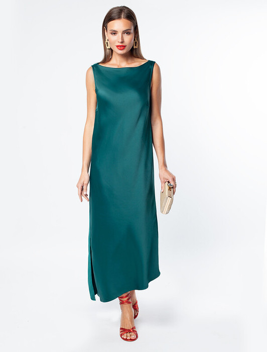 Платье с горловиной формы лодочка выполнено из плотного полуматового сатина, напоминающего натуральный шёлк. Лаконичная модель дополнена ассиметричным низом с разрезом, скроенная по косой струится и переливается при каждом шаге. Ткань почти не мнется и имеет легкий вес. Роскошная модель для праздничного мероприятия, хорошо будет сочетаться с жакетом или кожаным верхом.