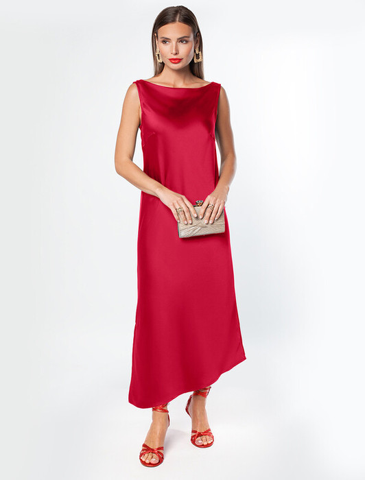 Платье с горловиной формы лодочка выполнено из плотного полуматового сатина, напоминающего натуральный шёлк. Лаконичная модель дополнена ассиметричным низом с разрезом, скроенная по косой струится и переливается при каждом шаге. Ткань почти не мнется и имеет легкий вес. Роскошная модель для праздничного мероприятия, хорошо будет сочетаться с жакетом или кожаным верхом.
