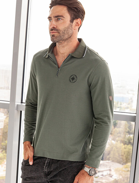 Поло прямого силуэта выполнено из фактурного трикотажа. Плетеный ворот с застежкой планкой на металлической молнии украшен контрастной полоской. Эластичный хлопковый материал хорошо пропускает воздух, а одежда из него не пилингуется и комфортно облегает фигуру. Однотонная модель с длинными рукавами дополнена небольшим вышитым логотипом бренда.