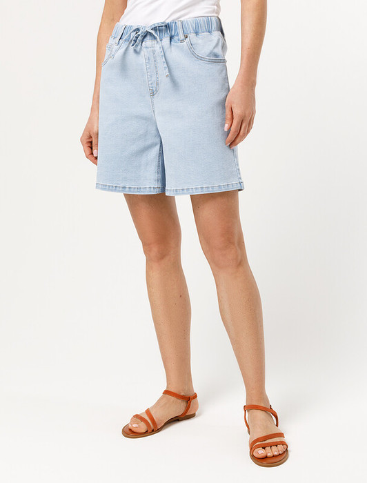 Шорты с легкой декоративной стиркой выполнены из эластичного денима. Модель с ложным гульфиком и поясом из эластичной резинки со шнурком из основного полотна. За счет эластана изделие хорошо тянется и гарантирует комфорт и формоустойчивость. Подходит для любой фигуры.