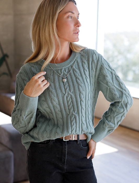 Совместные покупки Челябинск Женская одежда Джемперы, свитеры, водолазки — Vilatte Свитер фактурной вязки с узором косы D39.330 светло-оливковый меланж