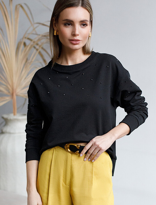 Свитшот выполнен из эластичного футера двухнитки. Изделие дополнили лаконичным принтом стразами в тон изделия. Расслабленный стиль поддерживает спущенная линия плеча, свободный силуэт и разрезы по бокам. Модель сочетается в костюме с брюками D44.135, D44.136, D44.137 и юбкой D46.034