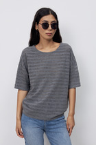 Свитшот выполнен из эластичного футера двухнитки. Изделие дополнили лаконичным принтом стразами в тон изделия. Расслабленный стиль поддерживает спущенная линия плеча, свободный силуэт и разрезы по бокам. Модель сочетается в костюме с брюками D44.135, D44.136, D44.137 и юбкой D46.034