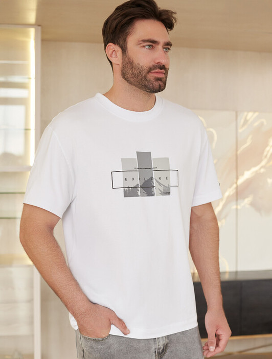 Совместные покупки Челябинск Мужская одежда Футболки — Vilatte Свободная футболка с авторским принтом U49.048 белый_explore прямоуголь