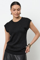 Эффектный топ черного цвета из мягкого хлопка с эластаном представлен в стильном исполнении с матовым покрытием металлик. Мелкий рубчик визуально вытягивает силуэт и подчеркивает фигуру, делая образ более стройным и аккуратным. Круглый ворот и суженные лямки акцентируют внимание на линии ключиц, делая образ утонченным и изысканным, Благодаря деликатному блеску топ подходит для тех, кто ценит утонченность и стремится добавить в образ немного сияния без перебора -  это отличный вариант топа для любительниц минимализма.