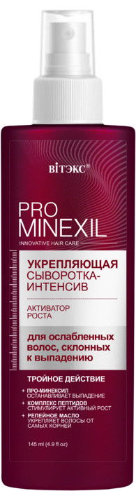 Интенсивная терапия против выпадения волос. Высокая эффективность для мужчин и женщин Стресс, усталость, недосыпание, агрессивное воздействие окружающей среды, гормональный и метаболический дисбаланс могут приводить к усилению выпадения волос. Про-минексил останавливает выпадение. Комплекс пептидов стимулирует активнфый рост. Репейное масло укрепляет волосы от самых корней. Интенсивная сыворотка – это концентрат природных и высоконаучных компонентов-активаторов роста волос, которые эффективно уменьшают выпадение. Основные действующие компоненты: Про-минексил комплекс пептидов, репейное масло, масла корицы и розмарина, никотинамид (витамин B3), глицин, биотин. Эффективная борьба с алопецией (выпадением), увеличение количества волос на стадии роста. Омоложение фолликулов, активизация роста сильных, крепких, здоровых волос. Укрепление волосяных луковиц, насыщение их ценнейшими питательными элементами. Увеличение плотности и густоты волос, предотвращение истончения. Сыворотка не утяжеляет и не склеивает волосы, не оставляет следов.