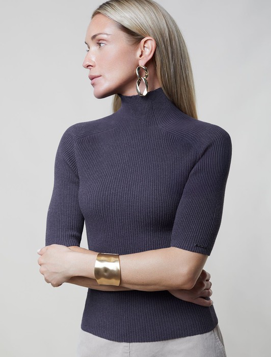 Состав: 82%Хлопок 18%ПА Плотность: 12 GG Параметры модели на первом фото: Рост 172, бюст 88, талия 64, бедра 88 Размер товара на первом фото: 42Водолазка тонкой вязки в рубчик выполнена из хлопка. Лаконичная модель с коротким рукавом дополнена металлическим логотипом бренда. Изделие идеально сидит по фигуре и не сковывает движений. Мягкая пряжа очень приятная к телу не колется и сохраняет тепло при этом не перегревая.