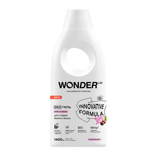 Гель для стирки WONDER LAB с ароматом нежного лотоса и сочной вишни подходит для стирки белых и светлых тканей любого типа.