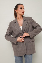 Жакет полуприлегающего силуэта с ассиметричным низом. По переду нагрудная вытачка, переходящая в прорезной карман с клапаном по правой стороне. Двухбортная застёжка на петли-пуговицы.