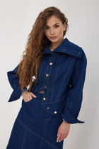 Прямой, слегка свободный силуэт, втачные рукава, двубортная застёжка на пуговицы, функциональные карманы с клапанами. Спинка со средним швом.