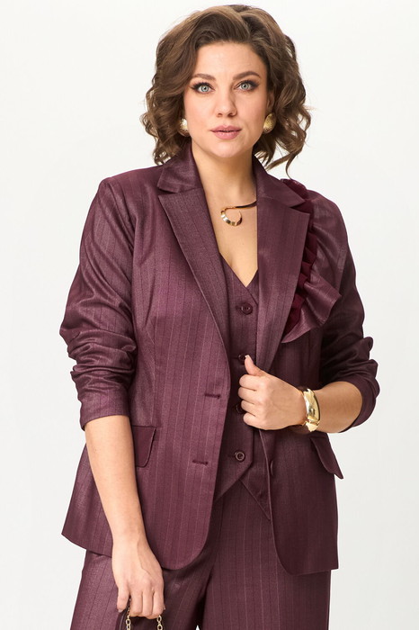 Однобортный жакет полуприталенного силуэта, на подкладке, с плечевыми накладками. Воротник пиджачного типа с отложными лацканами. По переду центральная застежка на петли и пуговицы и прорезные карманы с клапаном, талиевые вытачки и рельефы. Полочку жакета украшает съемная декоративная рюша на пуговицах. Низ бортов закругленной формы. Спинка со средним швом и рельефами. Рукав втачной двухшовный длинный.