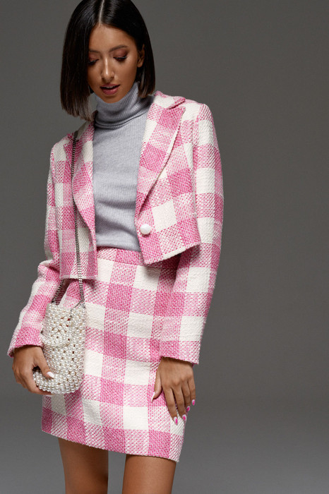 Жакет женский, укороченный на подкладке. V образный вырез горловины, остроугольные лацканы. Застежка центральная на одну пуговичку. Рукав втачной. Спинка со средним швом. Длина изделия 39, длина рукава 61.