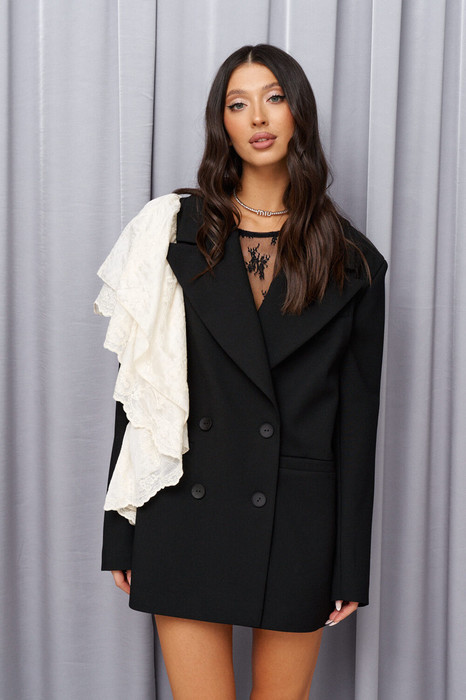 Жакет прямого свободного кроя выполнен из костюмной ткани черного цвета с акцентным воланом из хлопковой ткани в вышивкой. Характеристики: прямой свободный крой, подкладка, подплечники, отложной воротник с остроугольными лацканом, застежка центральная на петли пуговицы, прорезные карманы, рукав втачной прямого кроя.. По передней части изделия двойной волан, выполнен хлопковой ткани в вышивкой, переходящий на спинку. Длина по спинке 78 см, длина рукава от края горловины 81 см.