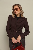 Жакет двубортный, полуприталленого силуэта. Выполнен из костюмной ткани белого цвета в полоску. Характеристика: отложной воротник с остроугольными геометрическими лацканами, вточной рукав, подклад, подплечники, талиевые выточки по переду, отрезной бочок, по переду изделия карманы-листочки талиевые вытачки по спинке. Длина рукава 24 см. Длина спинки от края горловины 72 см.