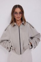 Жакет двубортный, полуприталленого силуэта. Выполнен из костюмной ткани светло-бежевого цвета. Характеристика: отложной воротник с остроугольными геометрическими лацканами, вточной рукав, подклад, подплечники, талиевые выточки по переду, отрезная боковая планка, по переду изделия карманы-листочки, талиевые вытачки по спинке, брендированная подкладка. Длина рукава 24 см. Длина спинки от края горловины 72 см.