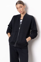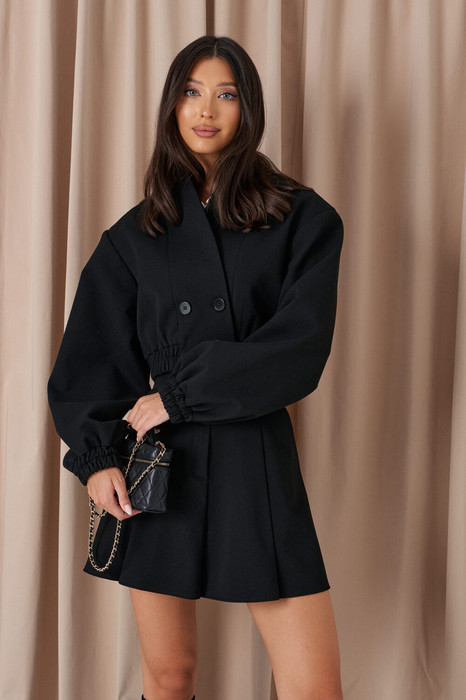 Укороченный жакет выполнен из костюмной ткани черного цвета. Воротник-стойка переходяший в V-образный вырез. Центральная застежка на пуговицах. Нижний край изделия на резинке. Рукав втачной, свободного кроя, манжета на резинке, подпелчники. Брендированная подкладка. Длина по спинке 42 см, длина рукава 60 см.